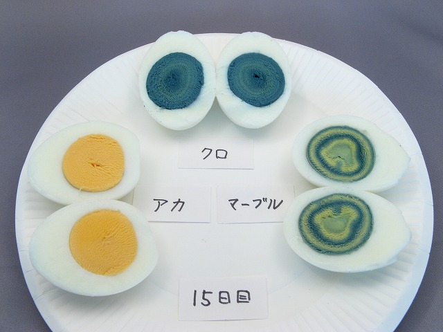 にわとりの餌に赤い色素のパプリカを添加した鶏、黒い色素を2日おきに添加した鶏、そして黒い色素を添加し続けた鶏、それぞれのゆでたまごはこうなります(゚Д゚;)
