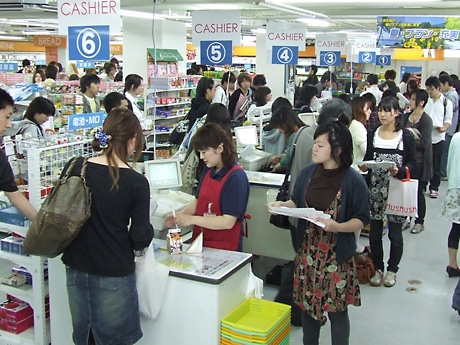 この平行方向のレジの並び方だと、お客さんの並ぶ列が複数あっても、割と不平が出にくい気がしません?