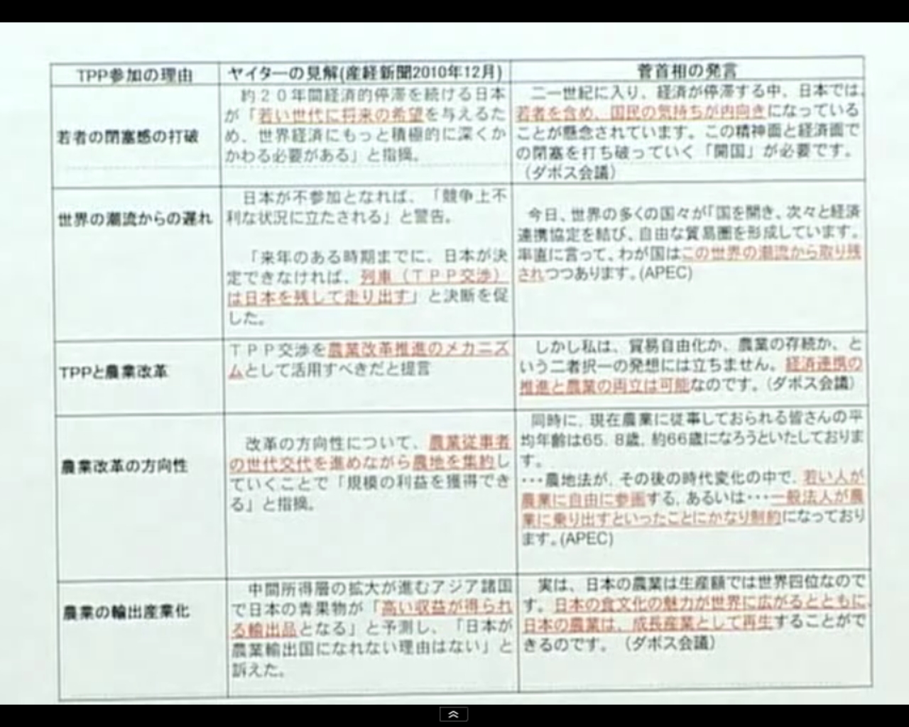 アメリカの農業ロビイスト、ようはアメリカの都合のいい様に日本を動かしたい人のインタビューとそっくり同じ意味の発言をしている。