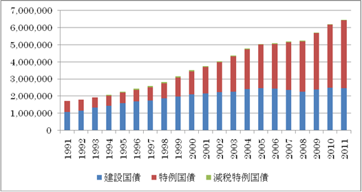 このグラフを見るとわかるように、実は道路なんかの建設国債は増えすぎてるってことはない。赤字国債が増えているだけなので、道路とか公共事業を悪玉にするのは間違い。