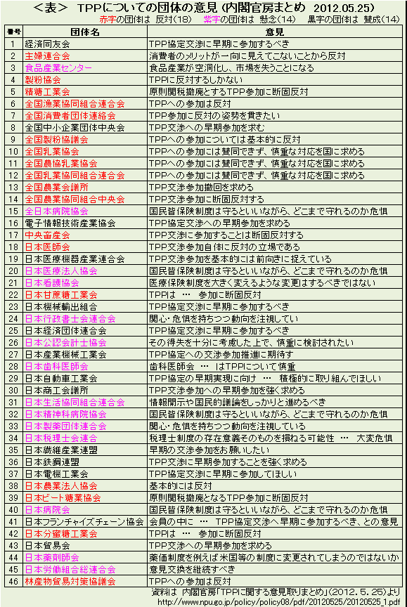 先週25日、政府はTPPについて、46の団体の意見を取りまとめて発表した。要約した表を下に示した。