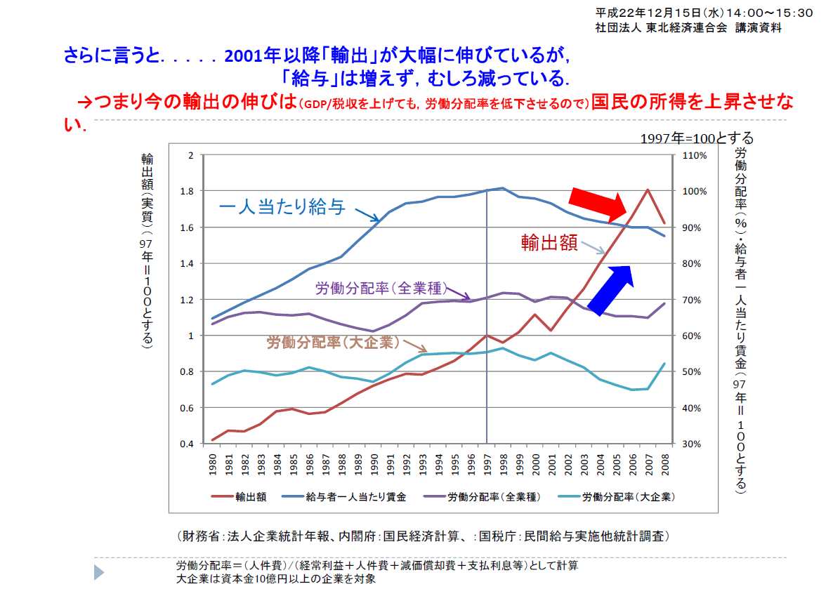 小泉さんの時が良かったって言ってる人は、あの時の輸出企業の好調がアメリカのバブルに支えられてただけで、実は日本人の賃金はむしろ下がってたということを知っておいたほうが良いかもしれない。