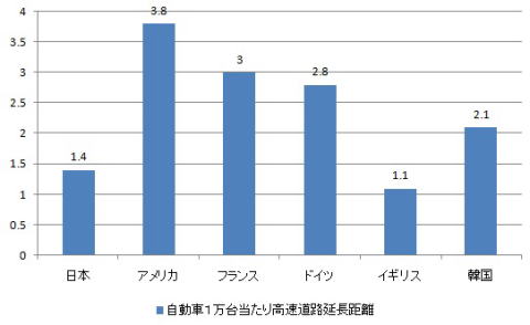 自動車1万台あたりの高速道路の延長距離で、いまや日本は中国と韓国にも遅れをとっています。別に長けりゃいいってもんじゃないでしょうが、今のところ不便を感じている人がいる時点で足りないのは事実です。
