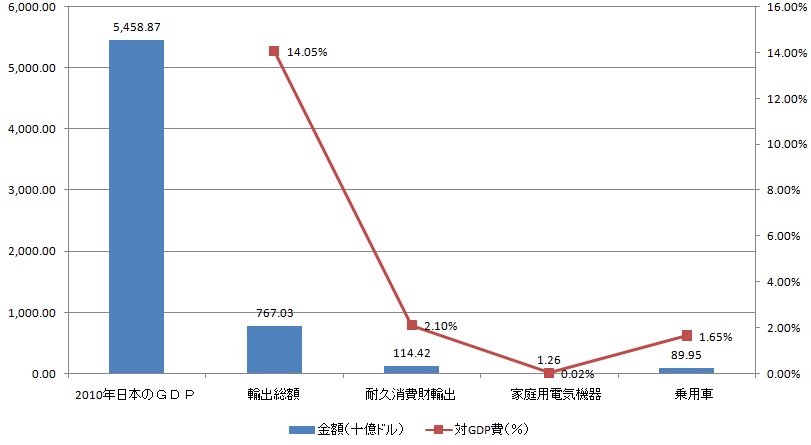 そしてそのわりと少ないと思える輸出額対GDP比のうちで、自動車や電化製品などの「耐久消費財」と呼ばれる、一般消費者の手元に直接届く分類の商品の占める割合は更に低く、GDP全体の1.67%です。