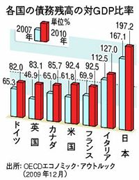 2010年度政府予算案では、マニフェスト(政権公約)実現に向けた事業費増加に対応し、景気低迷に伴う税収不足を国債発行で補うため、同年度末の国債発行残高は636兆9840億円と過去最高を更新する。一般会計税収の約17年分に相当。昨秋の米証券大手リーマン・ブラザーズの経営破綻(はたん)に端を発した世界的な経済危機を受け、各国とも積極的な財政出動で債務残高が膨らんだが、日本の残高は先進7カ国(G7)で突出している。(後略)