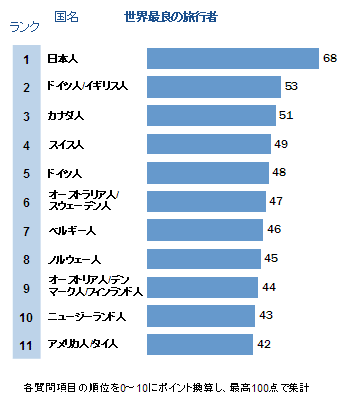日本人が高い評価を得たのは、旅行中の行儀(現地のエチケットや常識に従って行動する)、礼儀正しい、ホテルで騒がない、苦情が少ない、部屋を清潔に使うなどの項目。また、旅先でのファッションも、上位4位がすべて欧州勢の中、5位に入っている。音が響きやすい木造の建物や民宿のような宿に慣れている日本人にとっては「ホテルで騒がない」は当たり前、ということだろうか。