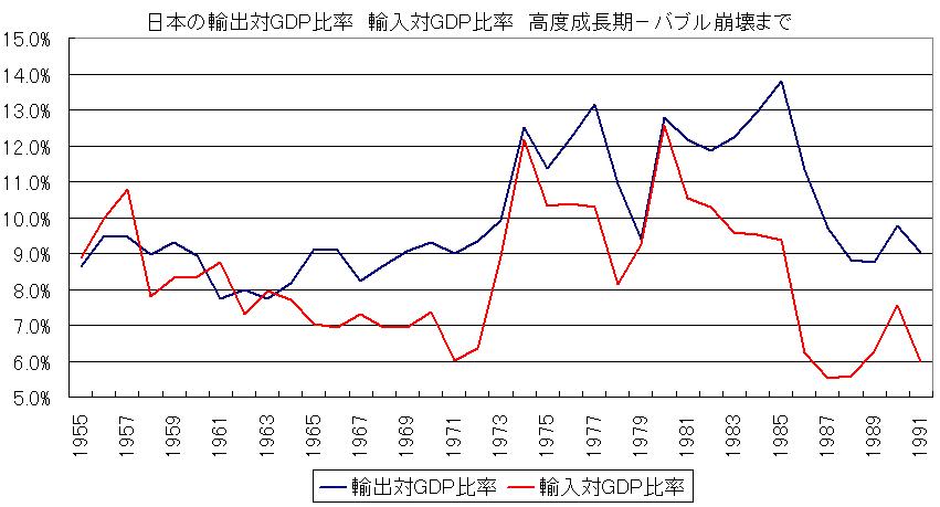 高度経済成長期でもGDPに対する輸出額の比率は10%を超えていません。ここ数年は輸出額-輸入額がマイナスになっていて、貿易が経済成長の足を引っ張っている有様です。その大きな原因は、原発を停止したことによる原油やガスの輸入費が嵩んだせいなのですけども。