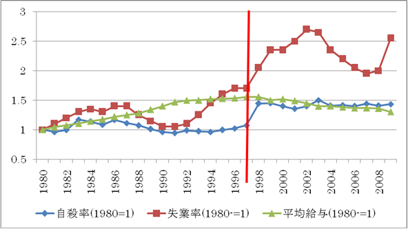 日本の自殺率、失業率、平均給与の推移(80年=1)