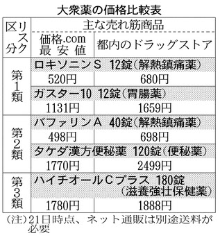 下げ幅が大きいのは副作用リスクの高い第1類医薬品。価格比較サイト「価格・com」の最安値は21日時点でロキソニンS(12錠)が520円(ドラッグストア店頭680円)、胃腸薬「ガスター10(12錠)」が1131円(同1659円)だった。店頭の値引き販売が常態化している第2類もネットの最安値が1~2割安い商品が多い。