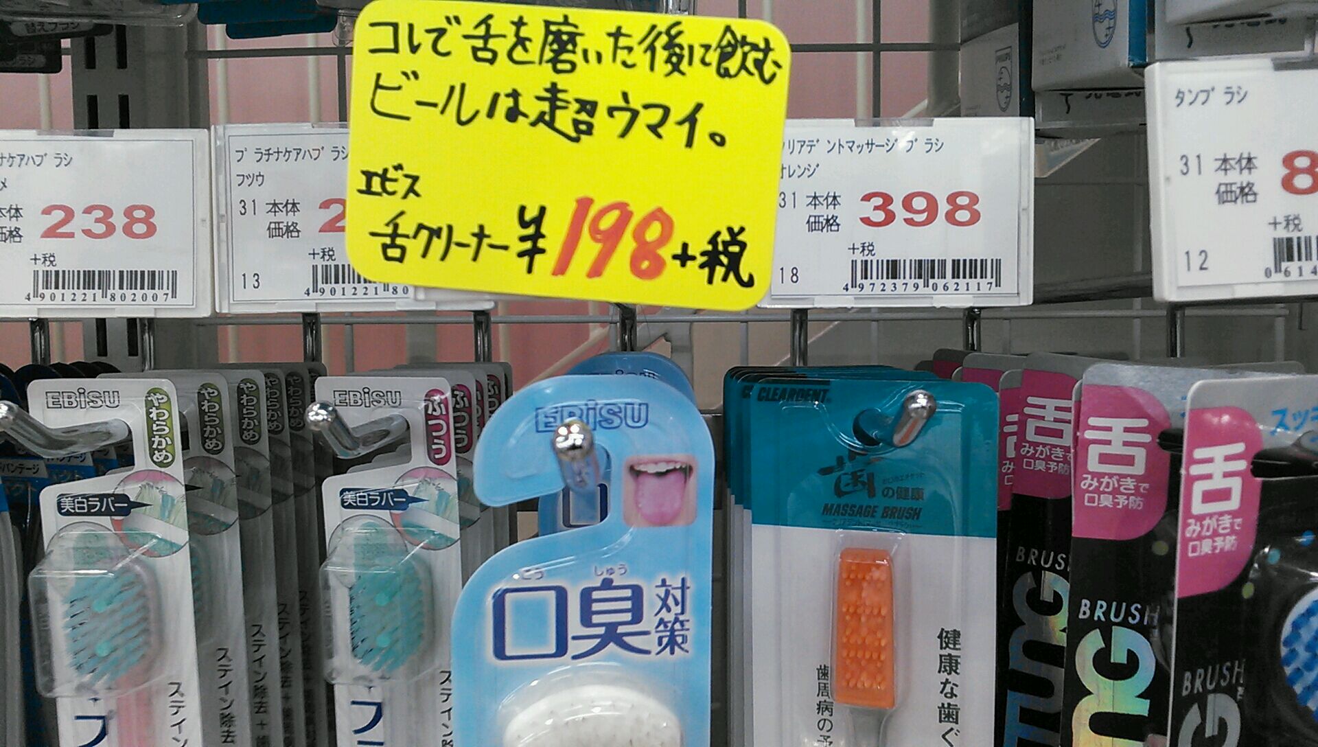 で、それを思い出して各店の舌クリーナーにこの様な荒ぶる手書き文字のPOPを貼ったところ、どの店でも前月比で200%overに売れ個数が伸びました。毎月5個売れていたところを、コンスタントに二桁に乗り、月によっては16個というところ。