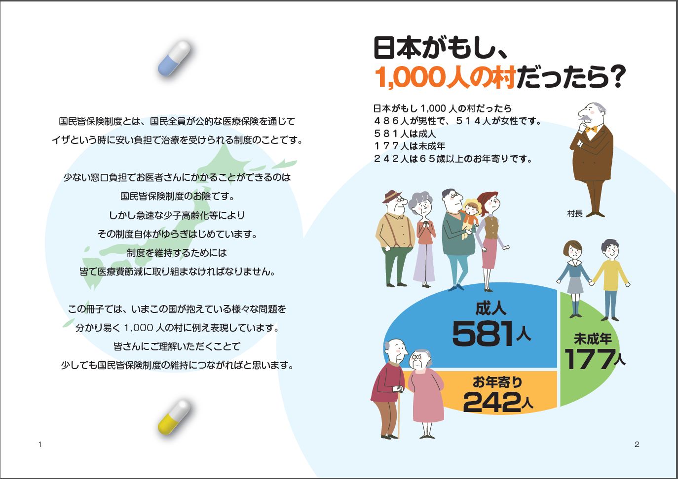 日本がもし人口1000人の村だったら、242人は65歳以上の高齢者。今は514人で242人の高齢者を支えていますが、2050年には436人で388人のお年寄りを支えねばならない。
