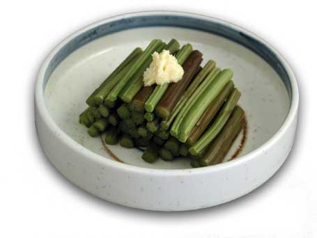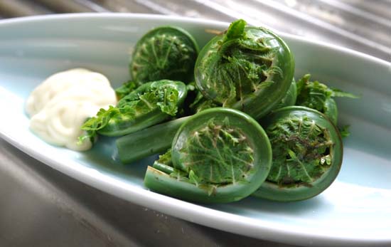わらびとこごみ。わらびはしょうが醤油で。こごみは茹でてマヨネーズを付けて頂く。