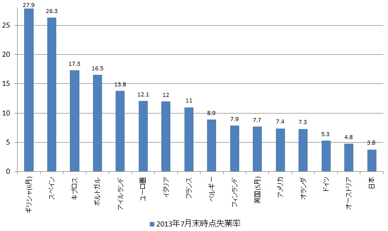 2013年7月末時点 ユーロ主要国及び日米英の失業率(単位:%)