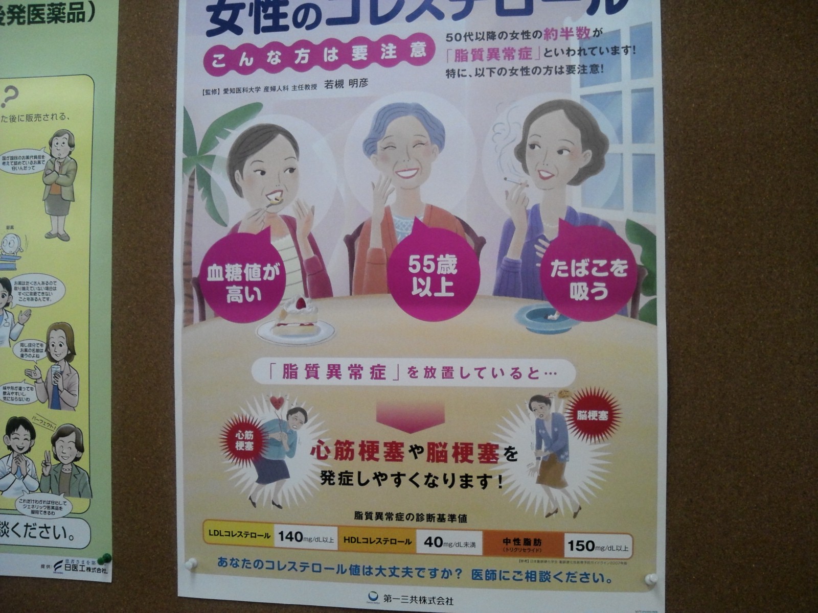 ウチの調剤室の待合に貼ってあるポスターなのですが、ちょっとおもしろいですね。「脂質異常症に気をつけろ!!」と言いつつ、