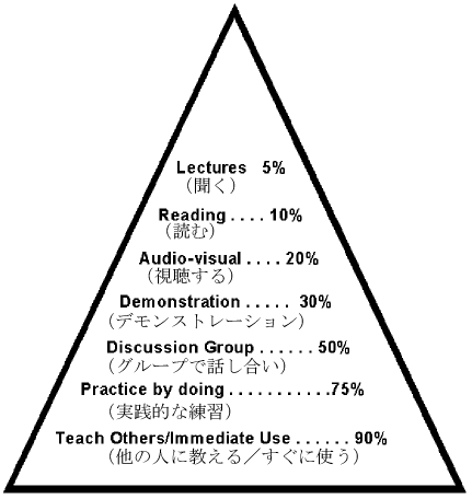 そこで、どうやったら生徒の記憶に焼き付けることができるのか考えていましたら、例の学習ピラミッドを思い出しました。
