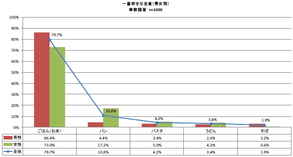 また、ごはん好きとパン好きには男女の差が大きく出た。ごはんを好きな人は男性が86%だが、女性は73%で13ポイントの差があった。一方、パンは女性の支持率が高く、男性4%で女性17%だった。3位以下は、パスタ4%、うどん3%、そば2%と続く。