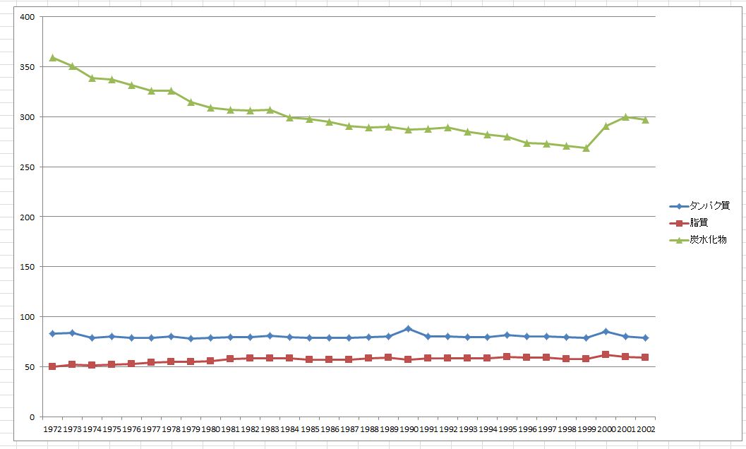「国民栄養の現状」という厚生労働省のデータベースから、タンパク質、脂質、炭水化物の摂取量の推移をグラフ化してみました。