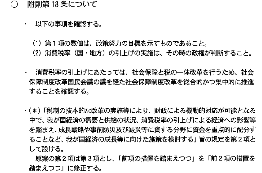 2014年に8%、2015年に10%に消費税を引き上げるという時期を決め打ちした話は無くなったようですが、(1)第1項の数値は~というとこrが気になります。