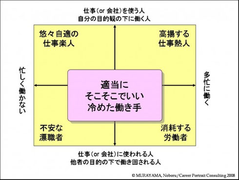 彼らの内面の声を代弁すれば、「働くって、しょせんこんなもんさ」とか、「うちの会社の今の仕事って、やっぱ限界あるよね」とか、そんなような感じでしょうか。そうした割り切り、しらけ、ある種のあきらめの境地を持ったその第5のグループは、会社員の中ではメジャーな存在になりつつあるような気すらします。