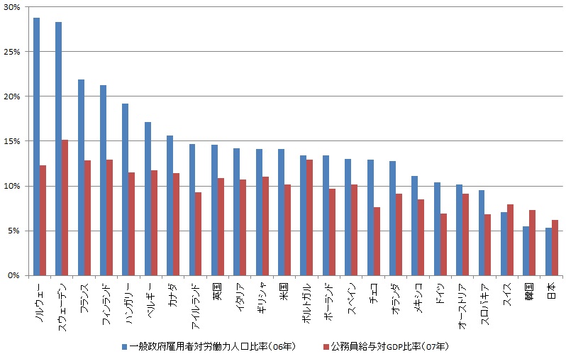 というか、そもそも日本の公務員の国民の対する割合や、GDPに対しての給与の割合は「他国と比べると」最低といっていいほど低いのです。