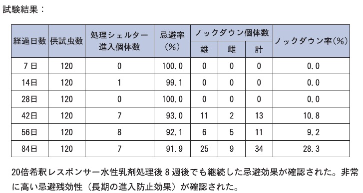 シフルトリン1%乳剤を20倍に薄めたものにベニヤ板を漬け込んだものを、紙で作ったシェルターを二つ作り、片方に処理済のベニヤ板を入れておいた結果だそうです。