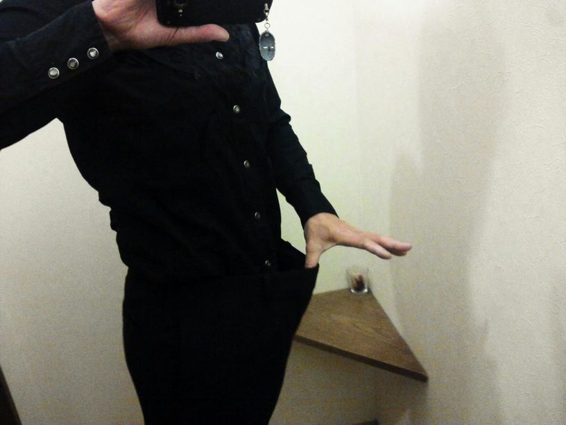 ちょっと黒いシャツだったのでイマイチわかりにくいかもしれませんが、コレが最高に太っていた時のウエスト90cmのズボンです。これを84cmまで詰めるということを頼みに言って参りました。