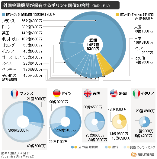ギリシャは国債の50%以上を海外に「ユーロ」建てで買ってもらっている。