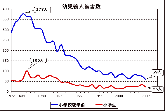 幼稚園生以下が殺される事件は8割も減っています。1960年代以前はさらに多くの幼児が殺されていました。